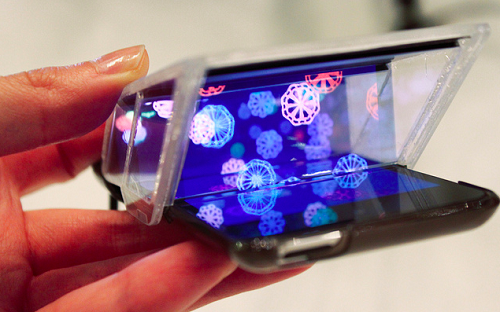 所有關(guān)注 3D 技術(shù)的目光都在打印機(jī)上時,這個來自日本 Tom Nagae / DIRECTIONS 公司的的掌上 3D 顯示屏回歸到最原始的光學(xué)原理來讓 iPhone 變成便攜 3D 影院。折疊起來時,Pal Top Theater(掌上影院) 看上去像一個普通的手機(jī)殼。里面是有三塊鏡片組成:一塊大鏡片和兩塊成一定角度的小鏡片。看上去非常簡單,但效果卻非常好。Palm Top Theater 有一個免費的 app 供用戶下載,這個設(shè)備并不是支持 iPhone 上的所有電影,而是一種把電影畫面分成三層的特殊格式。 目前,iPhone 版的 Palm Top Theater 售價為 33 美元,Tom Nagae / DIRECTIONS 公司也已經(jīng)制作了 iPad 版顯示屏,但并沒有公開發(fā)售。