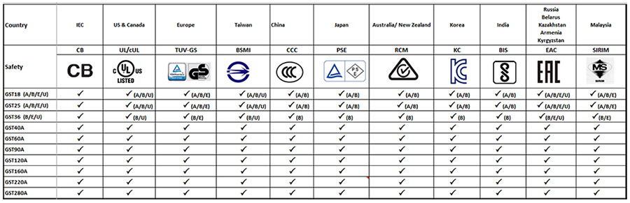 為了讓各位經(jīng)銷伙伴或客戶可快速了解GST家族擁有哪些國(guó)家安規(guī),明緯特別整理列表如下: