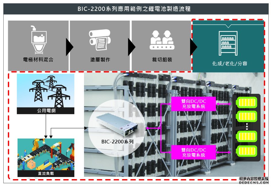 如下圖所示,電池生產(chǎn),從電極制作開始一直到出貨期間,部分制程需透過電池的充放電,以確保電池的功能與效能。所有制程中,以「化成」與「老化&分容」這兩大制程耗能最巨,其中「化成」更是影響電池質(zhì)量的關(guān)鍵制程之一。在過去,電池生產(chǎn)線需采用一臺充電器搭配一臺逆變器,方能實現(xiàn)「化成」與「分容」兩個制程。此作法不僅占據(jù)較大的空間,整體成本也無法有效下降;越多原件也意味著維護成本升高,信賴度大幅降低。