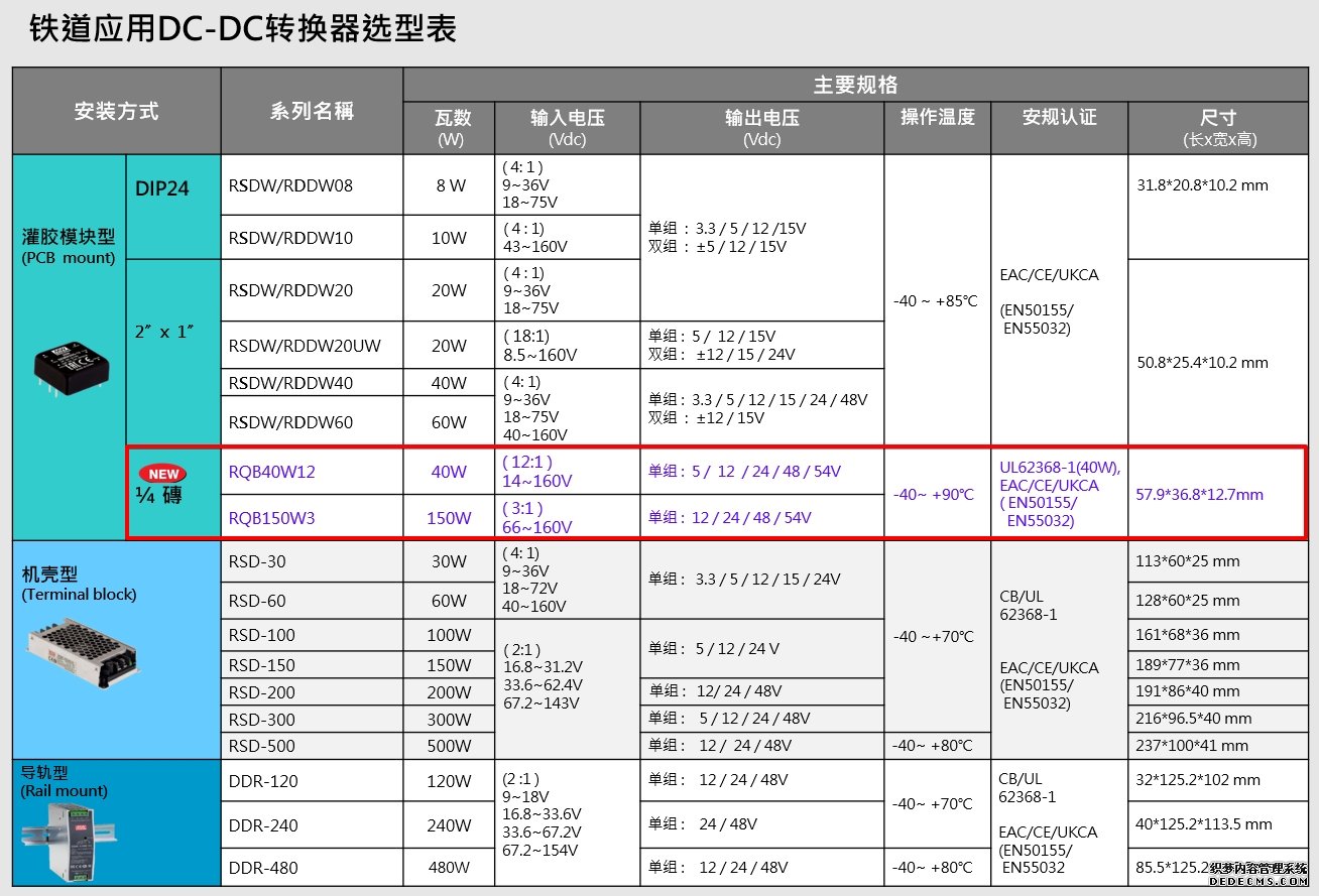 明緯在鐵道交通車載系統(tǒng)應用領(lǐng)域,繼推出灌膠模塊型、機殼型、導軌型的RSDW/ RDDW/ RSD/ DDR系列8~480W后(詳如下表),新推出了灌膠模塊1/4磚40W、150W寬壓輸入RQB40W12 (12倍壓14~160Vdc)與RQB150W3(3倍壓66~160Vdc)系列。